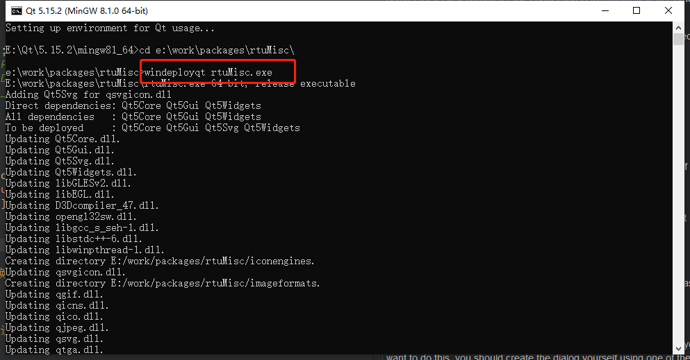 1.4 通过windeployqt xxx.exe命令,它会自动找到可执行文件需要的所有动态链接库,并将它们拷贝到当前文件夹中