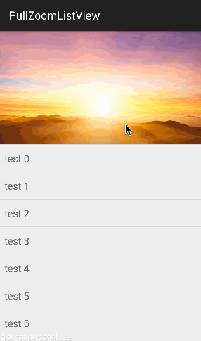 /** * Created by gyzhong on 15/3/22. */ public class PullZoomListView extends ListView { /*头部View 的容器*/ private FrameLayout mHeaderContainer; /*头部View 的图片*/ private ImageView mHeaderImg; /*屏幕的高度*/ private int mScreenHeight; /*屏幕的宽度*/ private int mScreenWidth; private int mHeaderHeight; /*无效的点*/ private static final int INVALID_POINTER = -1; /*滑动动画执行的时间*/ private static final int MIN_SETTLE_DURATION = 200; // ms /*定义了一个时间插值器,根据ViewPage控件来定义的*/ private static final Interpolator sInterpolator = new Interpolator() { public float getInterpolation(float t) { t -= 1.0f; return t * t * t * t * t + 1.0f; } }; /*记录上一次手指触摸的点*/ private float mLastMotionX; private float mLastMotionY; /*当前活动的点Id,有效的点的Id*/ protected int mActivePointerId = INVALID_POINTER; /*开始滑动的标志距离*/ private int mTouchSlop; /*放大的倍数*/ private float mScale; /*上一次放大的倍数*/ private float mLastScale; /*最大放大的倍数*/ private final float mMaxScale = 2.0f; /*是否需要禁止ListView 的事件响应*/ private boolean isNeedCancelParent; /*这个不解释*/ private OnScrollListener mScrollListener ; /*下拉刷新的阈值*/ private final float REFRESH_SCALE = 1.20F; /*下拉刷新监听*/ private OnRefreshListener mRefreshListener ; public PullZoomListView(Context context) { super(context); init(context); } public PullZoomListView(Context context, AttributeSet attrs) { super(context, attrs); init(context); } public PullZoomListView(Context context, AttributeSet attrs, int defStyleAttr) { super(context, attrs, defStyleAttr); init(context); } private void init(Context context) { /*这里获取的是一个无用值,可忽略*/ final ViewConfiguration configuration = ViewConfiguration.get(context); mTouchSlop = ViewConfigurationCompat.getScaledPagingTouchSlop(configuration); /*创建头部View 的容器*/ mHeaderContainer = new FrameLayout(context); /*获取屏幕的像素值*/ DisplayMetrics metrics = new DisplayMetrics(); ((Activity) context).getWindowManager().getDefaultDisplay().getMetrics(metrics); mScreenHeight = metrics.heightPixels; mScreenWidth = metrics.widthPixels; /*设置头部View 的初始大小*/ mHeaderHeight = (int) ((9 * 1.0f / 16) * mScreenWidth); LayoutParams absLayoutParams = new LayoutParams(mScreenWidth, mHeaderHeight); mHeaderContainer.setLayoutParams(absLayoutParams); /*创建图片显示的View*/ mHeaderImg = new ImageView(context); FrameLayout.LayoutParams imgLayoutParams = new FrameLayout.LayoutParams (ViewGroup.LayoutParams.MATCH_PARENT, ViewGroup.LayoutParams.MATCH_PARENT); mHeaderImg.setScaleType(ImageView.ScaleType.CENTER_CROP); mHeaderImg.setLayoutParams(imgLayoutParams); mHeaderContainer.addView(mHeaderImg); /*增加头部View*/ addHeaderView(mHeaderContainer); /*设置监听事件*/ super.setOnScrollListener(new InternalScrollerListener() ); } /*处理事件用*/ @Override public boolean onTouchEvent(MotionEvent ev) { final int action = ev.getAction() & MotionEventCompat.ACTION_MASK; switch (action) { case MotionEvent.ACTION_DOWN: /*计算 x,y 的距离*/ int index = MotionEventCompat.getActionIndex(ev); mActivePointerId = MotionEventCompat.getPointerId(ev, index); if (mActivePointerId == INVALID_POINTER) break; mLastMotionX = MotionEventCompat.getX(ev, index); mLastMotionY = MotionEventCompat.getY(ev, index); // 结束动画,目前没做处理,可忽略 abortAnimation(); /*计算算一次放缩的比例*/ mLastScale = (this.mHeaderContainer.getBottom() / this.mHeaderHeight); /*当按下的时候把这个标志为设为有效*/ isNeedCancelParent = true ; break; case MotionEvent.ACTION_MOVE: int indexMove = MotionEventCompat.getActionIndex(ev); mActivePointerId = MotionEventCompat.getPointerId(ev, indexMove); if (mActivePointerId == INVALID_POINTER) { /*这里相当于松手*/ finishPull(); isNeedCancelParent = true ; } else { /*这是一个关键值,通过这个值来判断是否需要放大图片*/ if (mHeaderContainer.getBottom() >= mHeaderHeight) { ViewGroup.LayoutParams params = this.mHeaderContainer.getLayoutParams(); final float y = MotionEventCompat.getY(ev, indexMove); float dy = y - mLastMotionY; float f = ((y - this.mLastMotionY + this.mHeaderContainer .getBottom()) / this.mHeaderHeight - this.mLastScale) / 2.0F + this.mLastScale; if ((this.mLastScale <= 1.0D) && (f <= this.mLastScale)) { params.height = this.mHeaderHeight; this.mHeaderContainer.setLayoutParams(params); return super.onTouchEvent(ev); } /*这里设置紧凑度*/ dy = dy * 0.5f * (mHeaderHeight * 1.0f / params.height); mLastScale = (dy + params.height) * 1.0f / mHeaderHeight; mScale = clamp(mLastScale, 1.0f, mMaxScale); // Log.v(“zgy”, “=======mScale=====” + mLastScale+”,f = “+f); params.height = (int) (mHeaderHeight * mScale); mHeaderContainer.setLayoutParams(params); mLastMotionY = y; /*这里,如果图片有放大,则屏蔽ListView 的其他事件响应*/ if(isNeedCancelParent ){ isNeedCancelParent = false; MotionEvent motionEvent = MotionEvent.obtain(ev); motionEvent.setAction(MotionEvent.ACTION_CANCEL); super.onTouchEvent(motionEvent); } return true; } mLastMotionY = MotionEventCompat.getY(ev, indexMove); } break; case MotionEvent.ACTION_UP: /*结束事件响应,做相应的操作*/ finishPull(); break; case MotionEvent.ACTION_POINTER_UP: /*这里需要注意,多点处理,这里的处理方式是:如果有两个手指按下,抬起的是后按下的手指,则不做处理 * 如果抬起的是最先按下的手指,则复原图片效果。 * */ int pointUpIndex = MotionEventCompat.getActionIndex(ev); int pointId = MotionEventCompat.getPointerId(ev, pointUpIndex); if (pointId == mActivePointerId) { /*松手执行结束拖拽操作*/ /*结束事件响应,做相应的操作*/ finishPull(); } break; } return super.onTouchEvent(ev);}@Overridepublic void setOnScrollListener(OnScrollListener l) { mScrollListener = l ;}private void ab