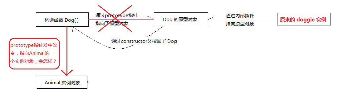 Dog.prototype 只是一个指针,指向的是原型对象,但是这个原型对象并不特别,它也只是一个普通对象。假设说,这时候,我们让 Dog.protptype 不再指向最初的原型对象,而是另一个类 (Animal)的实例,情况会怎样呢?