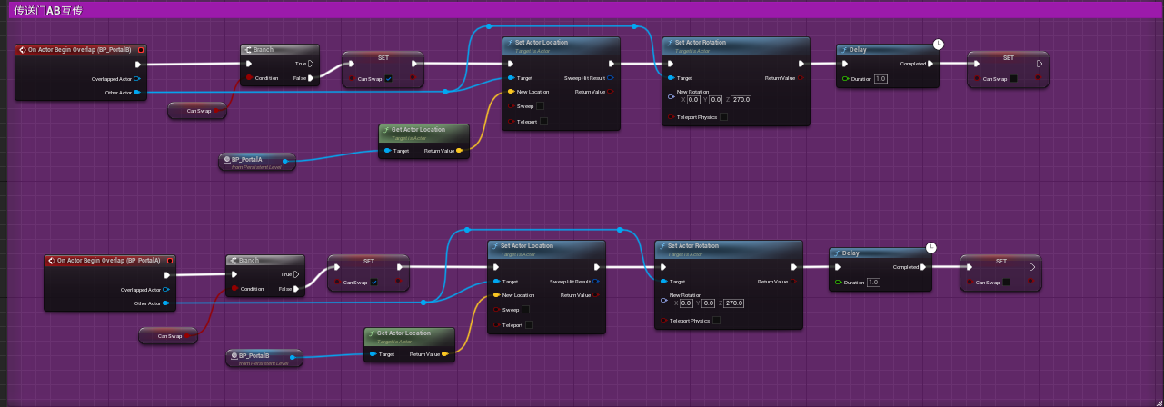 现在的传送门取消了对关卡蓝图的依赖性,传送逻辑和渲染逻辑被独立封装入两个蓝图,使用时只需将传送门A,B拖入场景实例化后互相指定即可;