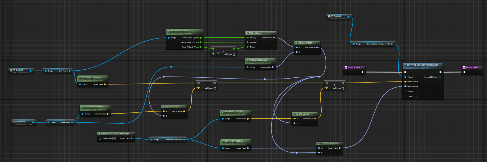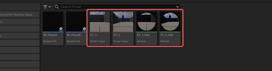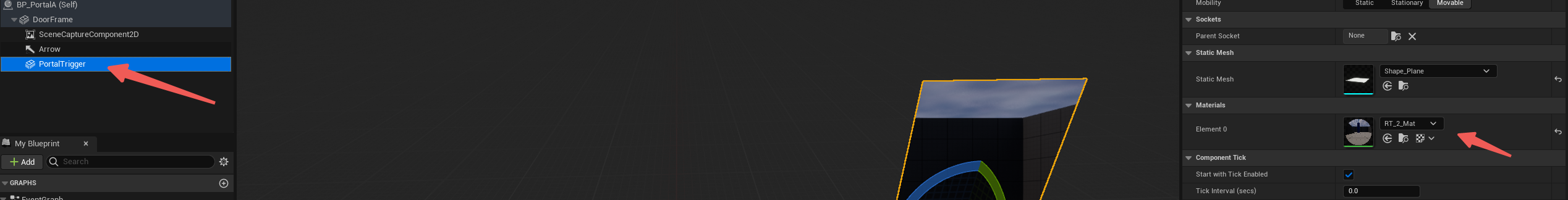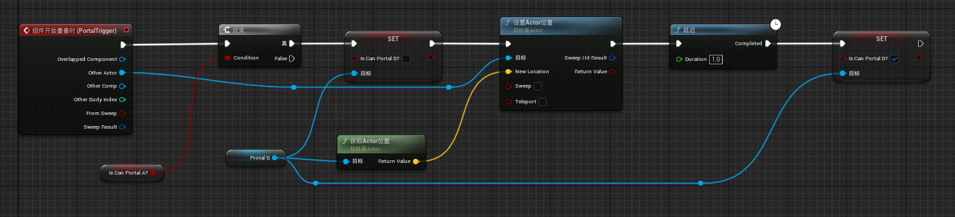 - 使用两个传送门Actor通过关卡蓝图进行传送控制,使用RanderTarget制作的材质来实现传送门的视觉效果