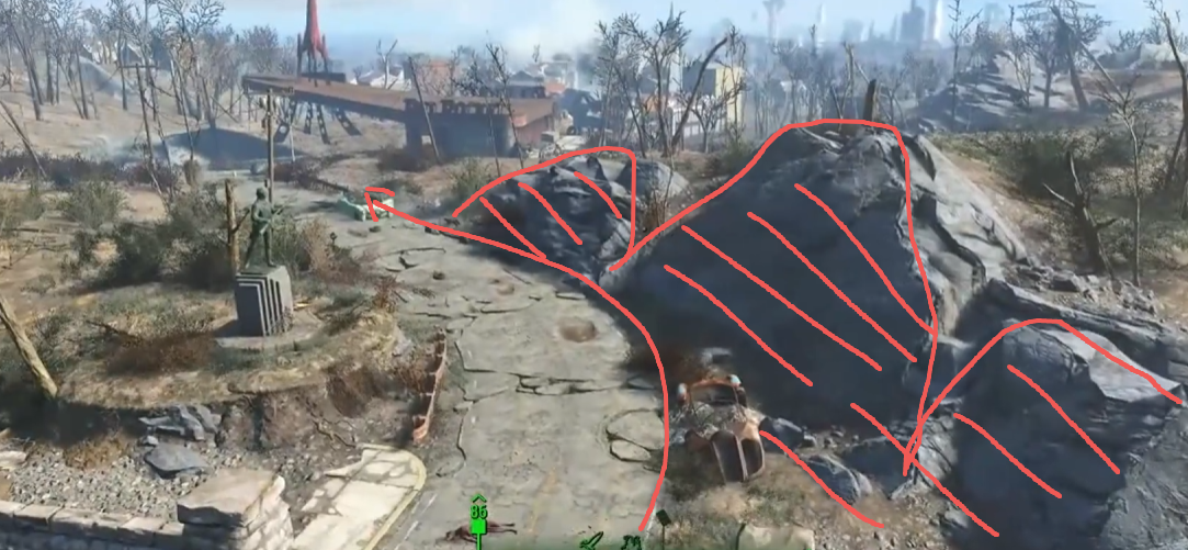 在《辐射4》中这么做的原因是因为远处有一个地标,显然设计师不希望这个地标提前引起玩家的注意
