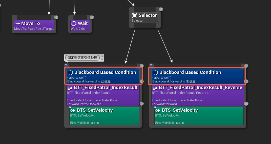 2.在上图的行为树中,这个两个blackboard节点分别决定了AI是正向巡逻还是反向巡逻
