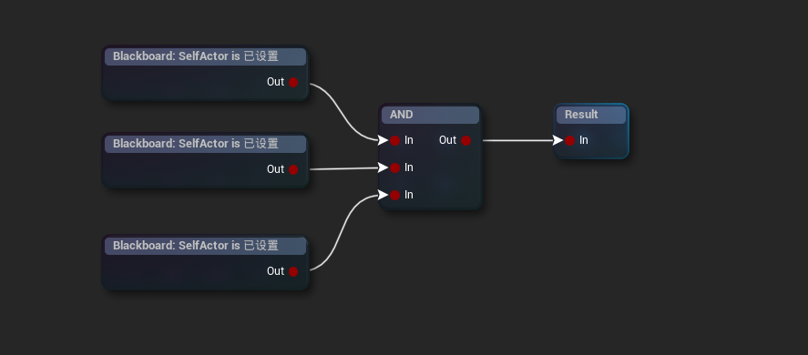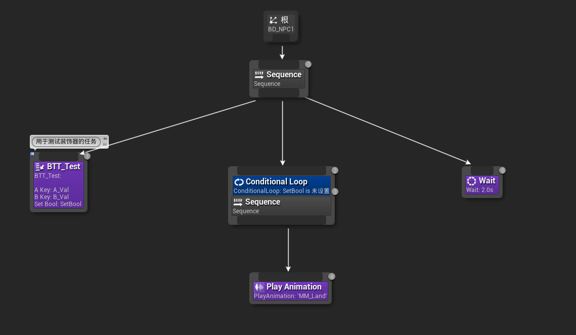 例子:在下列行为树中,我将TestTask中的SetBool的值设定为True,然后装饰器设置为未设置(当值为True),因此下列这个装饰器附加的节点将不会执行