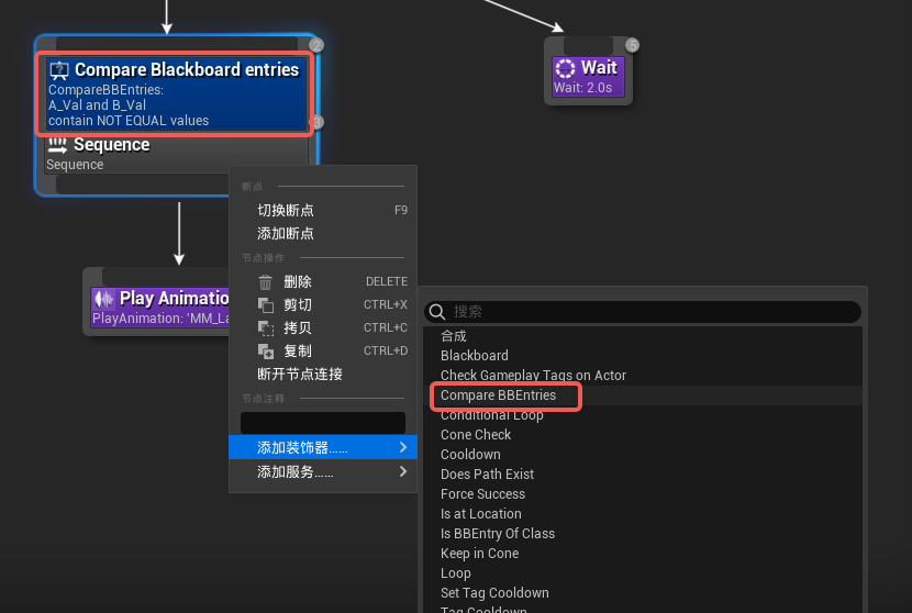 比较装饰器也是一种用于判断黑板布尔值的装饰器,在这个装饰器中可以通过比较两个黑板键值之间的大小来决定附加的节点要不要执行