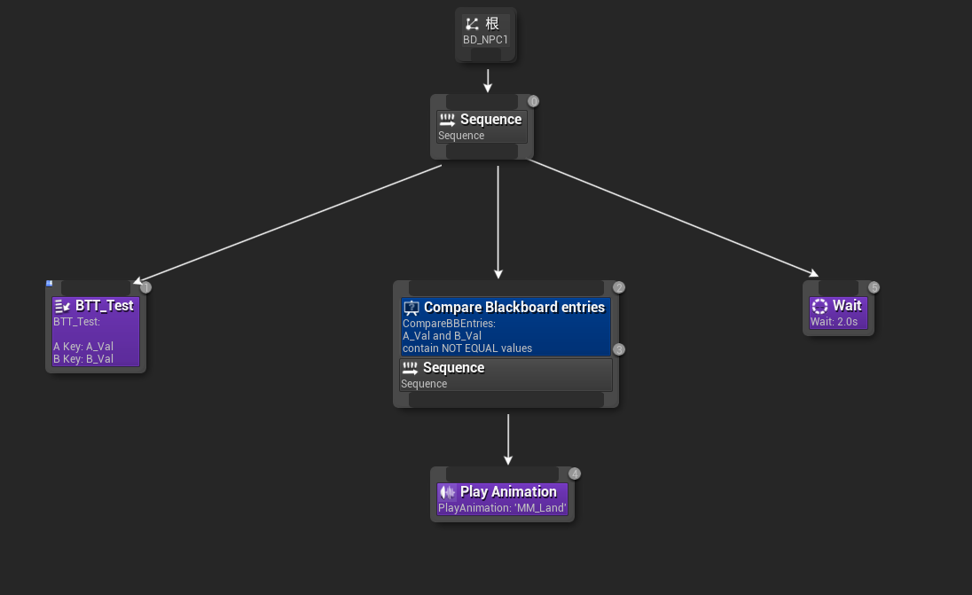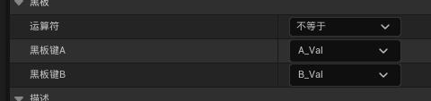 例子:在下列行为树中,我使用TestTask将两个大小不同的浮点值黑板键A_Val和B_Val给与黑板值,然后比较装饰器判断这个两个值是否符合装饰器细节面板中的定义