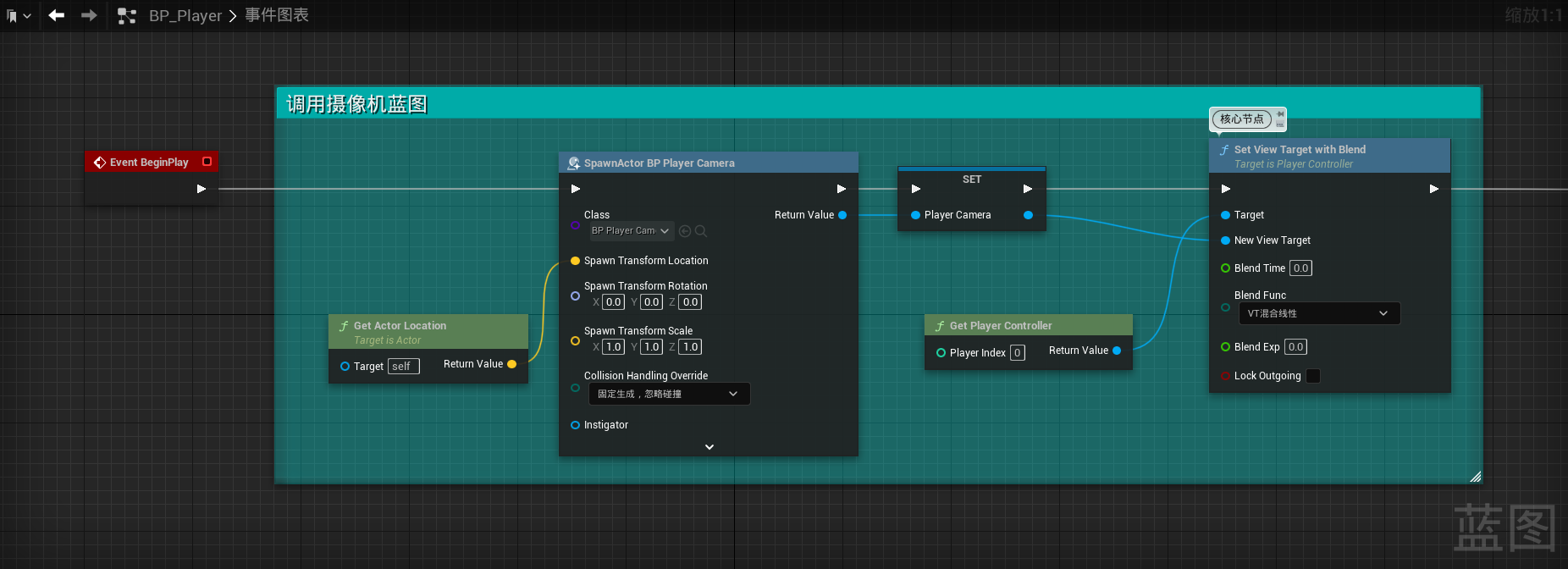 重点节点:Set View Target with Blend这个节点的可以设置多个摄像机间的切换