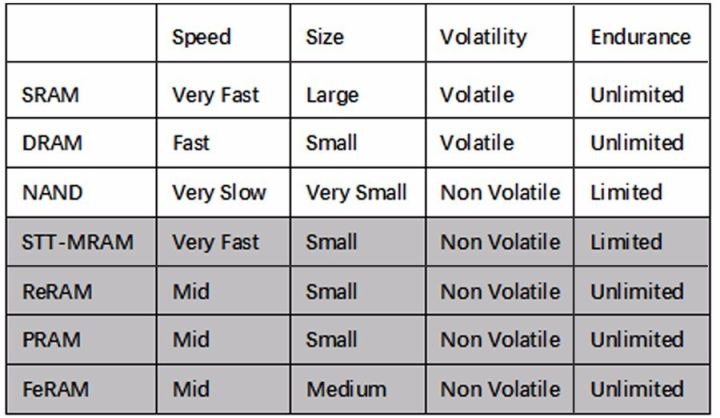 此外,一些新型的存储器也在研究的过程中,例如磁阻式RAM (MRAM--ST-MRAM、STT-MRAM)、电阻式RAM(ReRAM),PRAM、FeRAM等。
