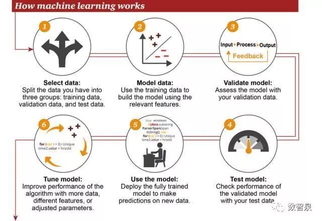 ③机器学习:数据科学家使用训练数据集来教计算机应该怎么做,然后系统执行该任务。首先存在大数据→机器会学习使用训练数据集来进行分类,调节特定的算法来实现目标分类→该计算机可学习识别数据中的关系、趋势和模式