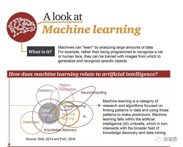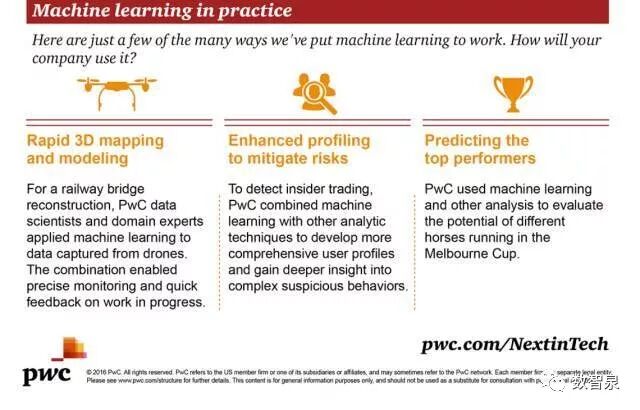 “机器学习正在进步,我们似乎正在不断接近我们心中的人工智能目标。语音识别、图像检测、机器翻译、风格迁移等技术已经在我们的实际生活中开始得到了应用,但机器学习的发展仍还在继续,甚至被认为有可能彻底改变人类文明的发展方向乃至人类自身。但你了解现在正在发生的这场变革吗?四大会计师事务所之一的普华永道(PwC)近日发布了多份解读机器学习基础的图表,其中介绍了机器学习的基本概念、原理、历史、未来趋势和一些常见的算法。为便于读者阅读,机器之心对这些图表进行了编译和拆分,分三大部分对这些内容进行了呈现,其中也加入了一些扩展链接,希望能帮助你进一步扩展阅读。”