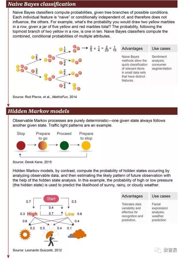 4. 朴素贝叶斯分类(Naive Bayes Classification):朴素贝叶斯分类器用于计算可能条件的分支概率。每个独立的特征都是「朴素」或条件独立的,因此它们不会影响别的对象。例如,在一个装有共 5 个黄色和红色小球的罐子里,连续拿到两个黄色小球的概率是多少?从图中最上方分支可见,前后抓取两个黄色小球的概率为 1/10。朴素贝叶斯分类器可以计算多个特征的联合条件概率。