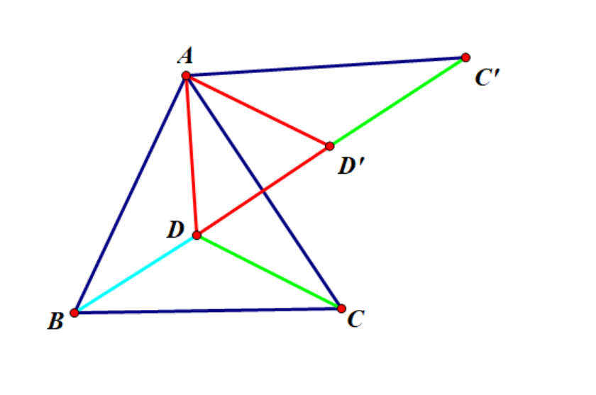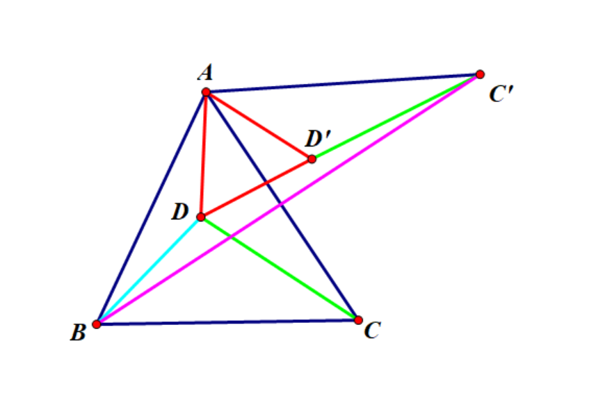 所以当 \(B,D,D',C'\) 四点共线时 \(AD+BD+CD\) 取最小值。