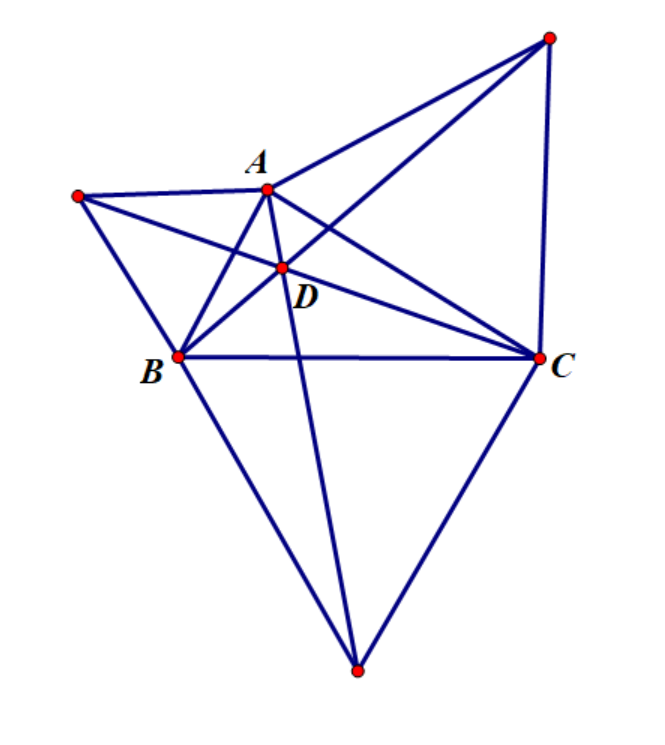 尺规作图轻松解决(分别以三边中一边,向三角形外作正三角形,如图相连,交点即为 \(D\))。