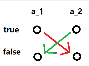 所以假设我们有条件「\(a_1\) 若为 true,则 \(a_2\) 为 false」,则我们这样连边: