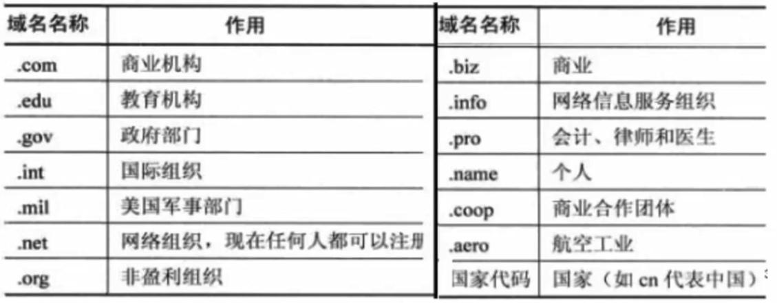 DNS协议:域名解析协议,用于把主机域名解析为对应的IP地址。是一个分布式数据结构,C/S工作模式。主要基于UDP协议,少数使用TCP,端口号都是53.常用域名如下:
