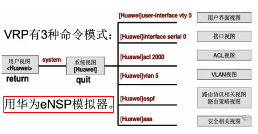 9、交换路由的操作系统VRP:华为公司为其网络设备开发的系统。用户通过运行命令行CLI,对网络设备进行设置。