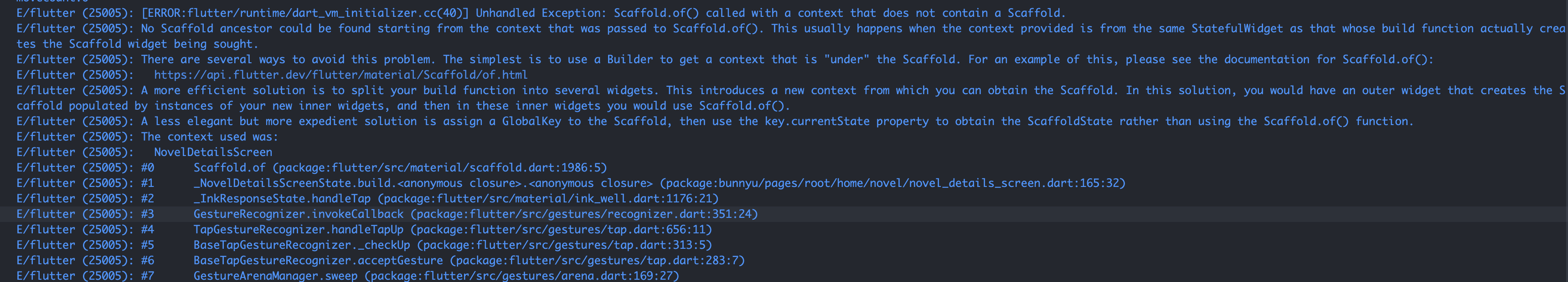 164、[ERROR:flutter/runtime/dart_vm_initializer.cc(40)] Unhandled Exception: Scaffold.of() called with a context that does not contain a Scaffold.No Scaffold ancestor could be found starting from the context that was passed to Scaffold.of(). This usually happens when the context provided is from the same StatefulWidget as that whose build function actually creates the Scaffold widget being sought.。。。。。。。。