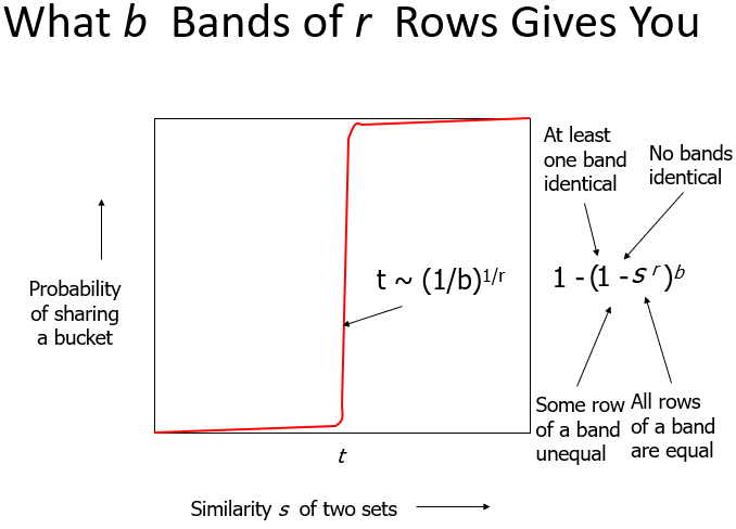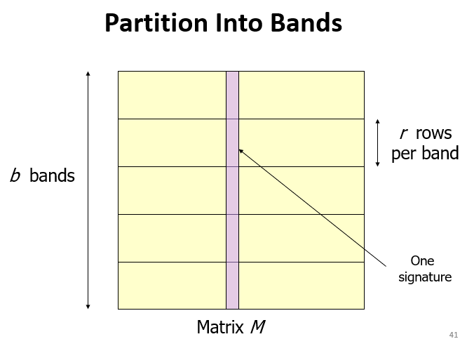 For minhash matrics:把矩阵列分为很多桶(buckets),相似度高的行放到相同的桶里。
