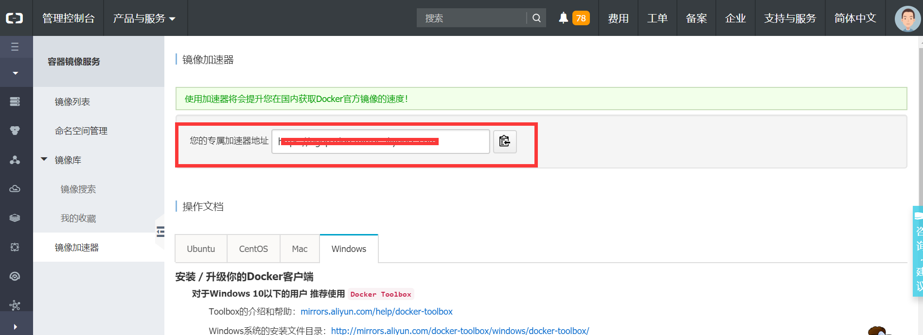 - 阿里云镜像加速:https://cr.console.aliyun.com。 创建自己的专属加速地址:见红色标注部分。