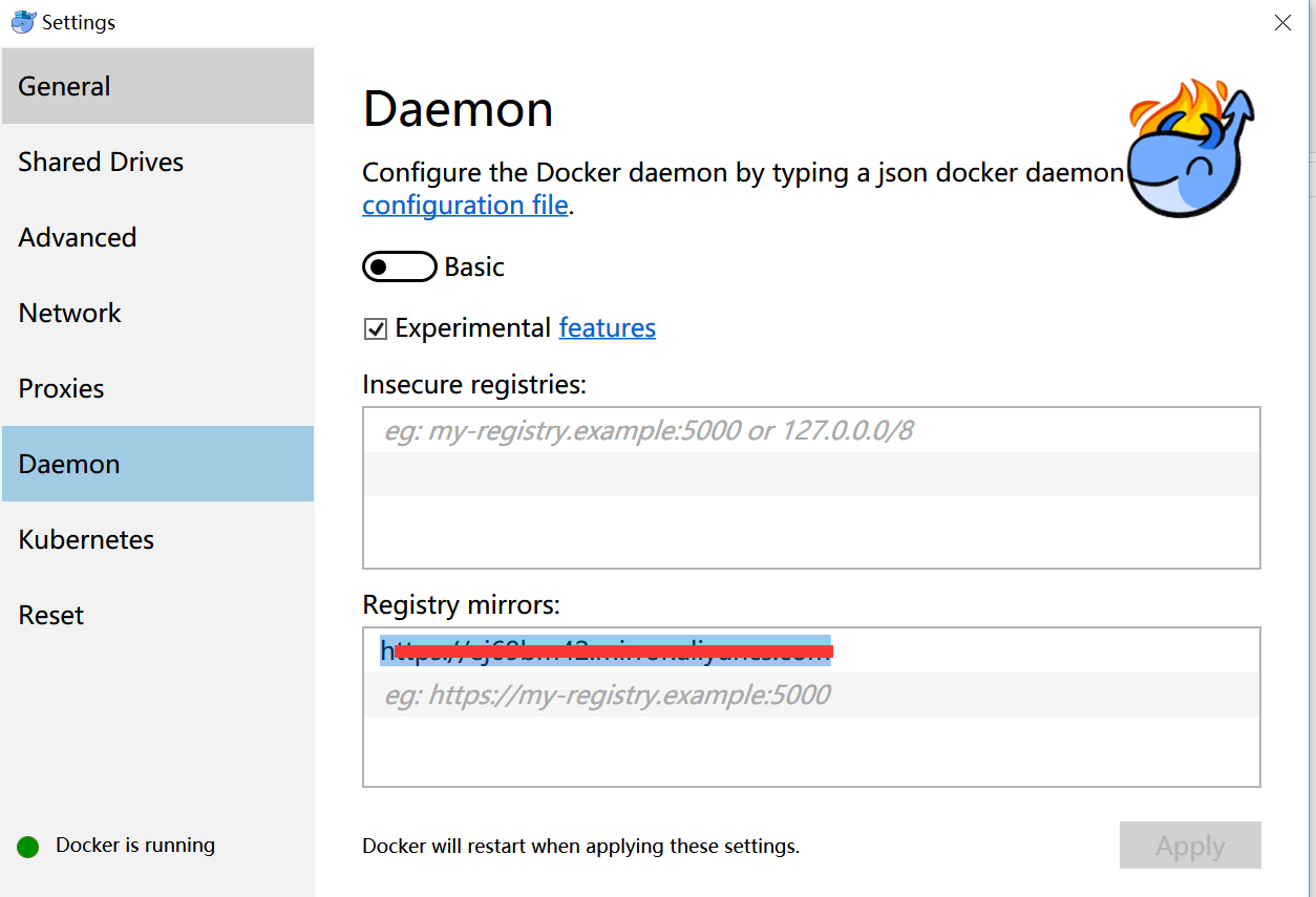 - 右击托盘中的docker图标选择settings-Daemon,将加速地址复制到红色标注位置,点击apply后重启docker。