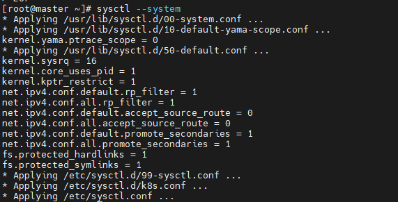 [root@master ~]# cat >>/etc/sysctl.d/k8s.conf<<EOF net.bridge.bridge-nf-call-ip6tables = 1 net.bridge.bridge-nf-call-iptables = 1 EOF