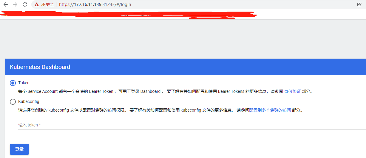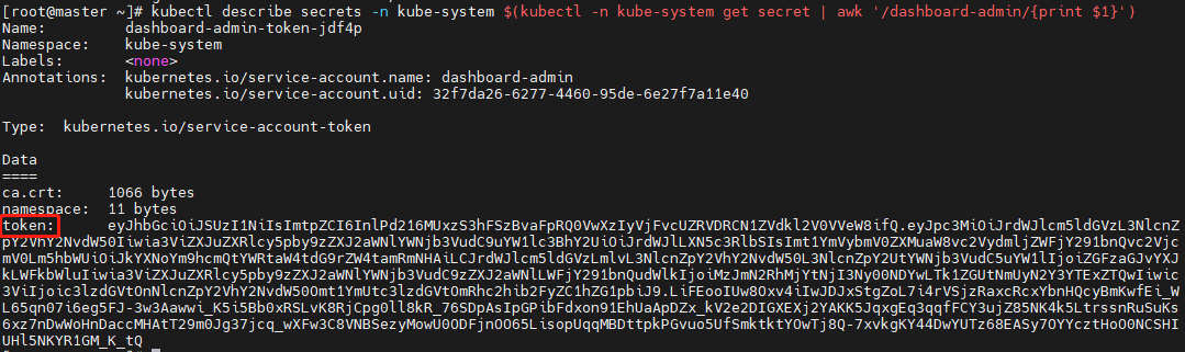 [root@master ~]# kubectl create serviceaccount dashboard-admin -n kube-system [root@master ~]# kubectl create clusterrolebinding dashboard-admin --clusterrole=cluster-admin --serviceaccount=kube-system:dashboard-admin kubectl describe secrets -n kube-system $(kubectl -n kube-system get secret | awk '/dashboard-admin/{print $1}')
