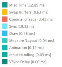 - android 4.x:蓝色-代表绘制时间,即创建和更新display lists的时间;红色-代表执行时间,即系统进行2D选软Display list的时间;橙色-代表处理时间,即CPU等待GPU完成渲染处理的时间