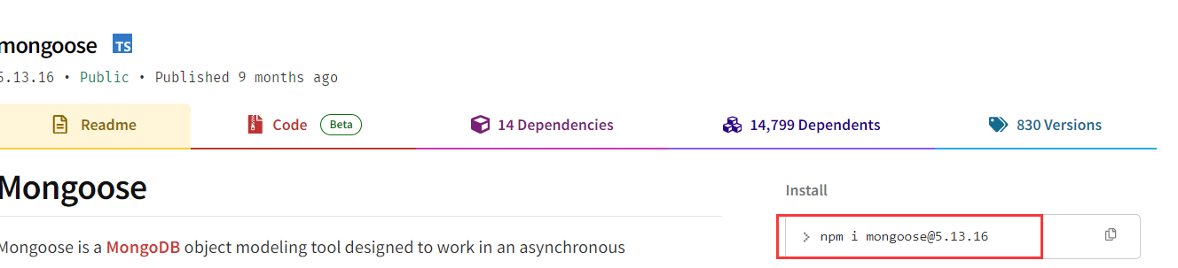复制命令去终端下载即可:npm i mongoose@5.13.16