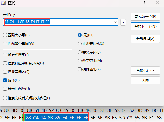 通过查找 83 C4 14 8B 85 E4 FE FF FF