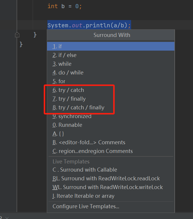 抛出异常:选中-->ctrl+alt+t