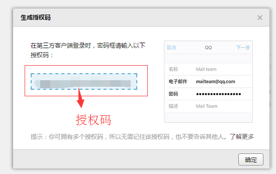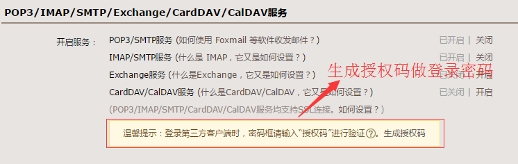 开启之后,点击‘生成授权码’(* 这个授权码是用来登录发送邮件的),如下图显示