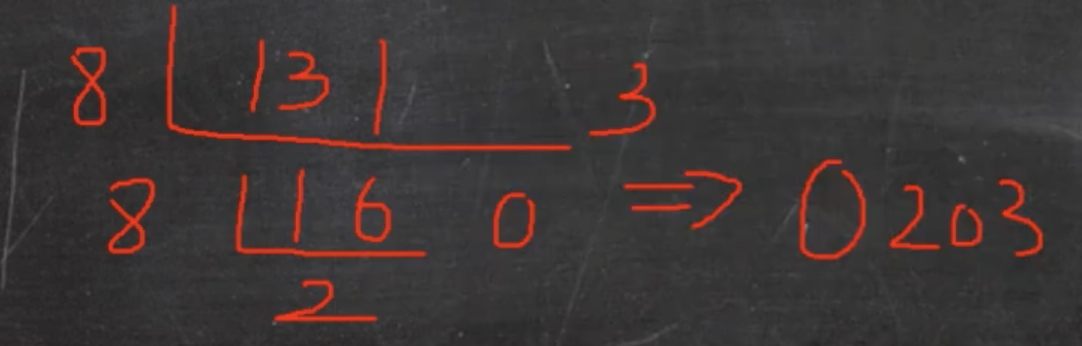 一直除以8, 知道商为0位置,然后将每一步的余数反过来写,就是八进制数。