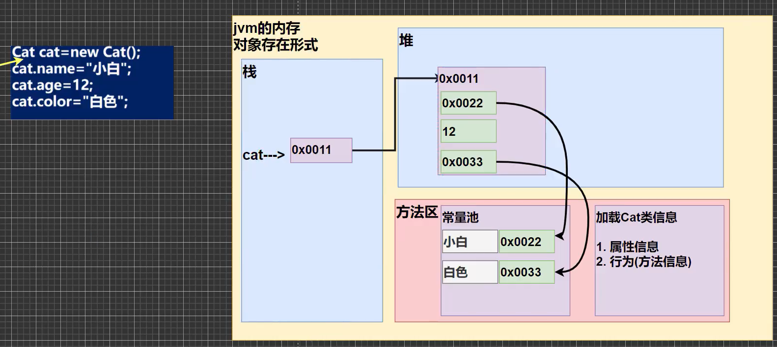 真正的对象是 new 出来的,在堆空间中分配的一块空间(如0x0011)。 cat 指向(引用)堆空间的这个内存, cat自己并不是对象,只是一个对象名。