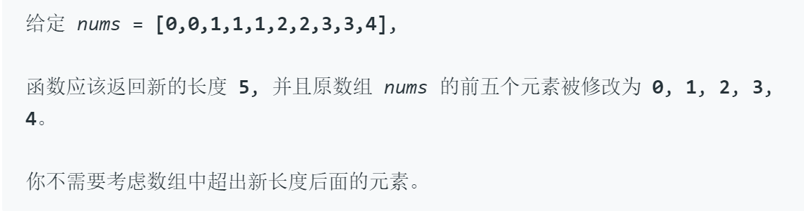 1 class Solution: 2 def removeDuplicates(self, nums: List[int]) -> int: 3 i = 0 #慢指针 4 j = 1 #快指针 5 length = len(nums) 6 while j < length: 7 if nums[i] != nums[j]: 8 i += 1 9 nums[i] = nums[j] 10 j += 1 11 return i+1 #i即为修改后最后一个非重复元素出现的位置