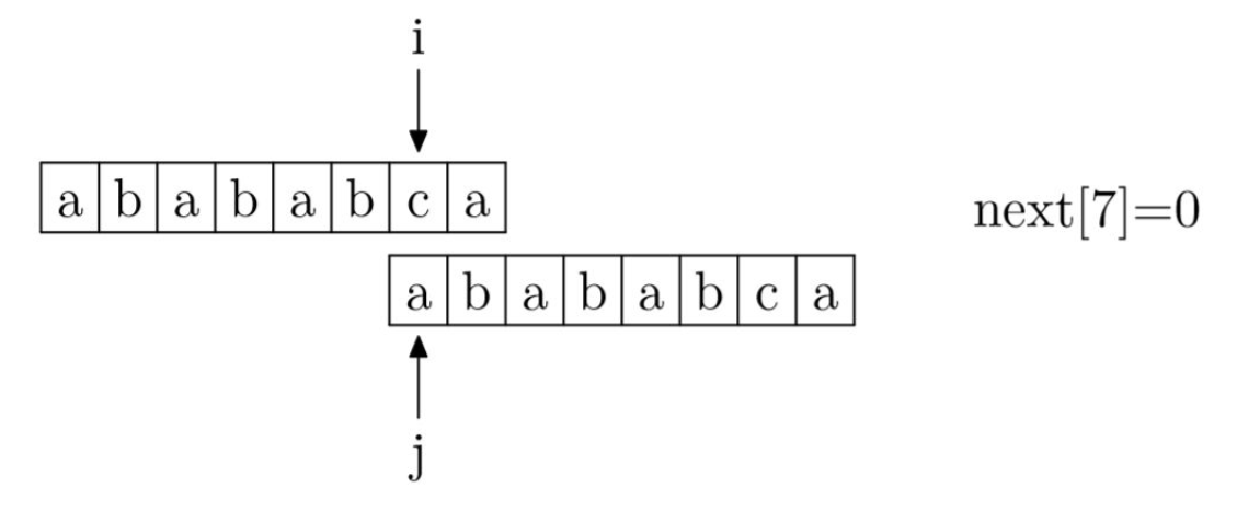如左图:当j指针移动到c时出现了不匹配的情况,这说明j之前的字符串ababab是跟待匹配字符串完全匹配的,而ababab前缀和后缀最长公共部分的长度为4,也就是说前四位和后四位是一样的(即模式串的前四位跟待匹配字符串的后四位是一样的),因此不必将j指针移动到初始位置,而将其移动到已经匹配的后一位,即第5位即可。