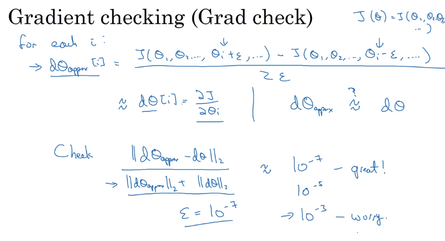 进行检验,对于每一个权重theta,计算 [J(theta+epsilon)-J(theta-epsilon)]/(2*epsilon),每一个结果都保存在一个矩阵里,然后同样的,将每一个theta实际的梯度按同样规则保存在矩阵里,最后求解两者的欧式距离然后和阈值比较