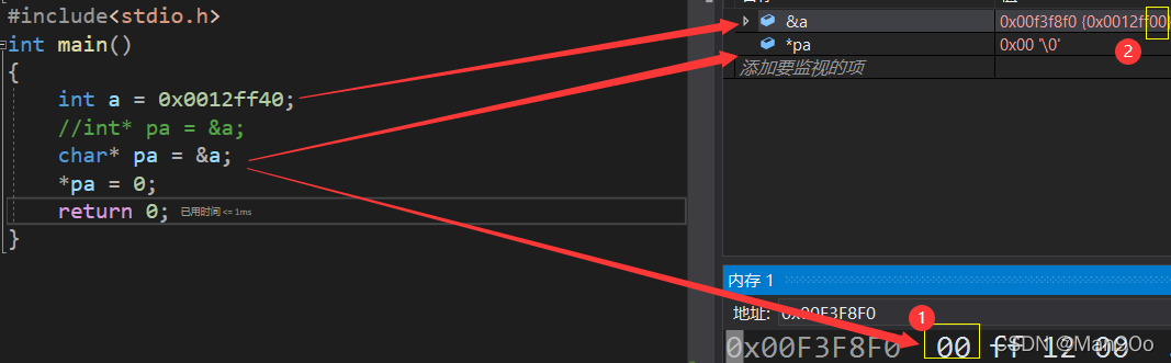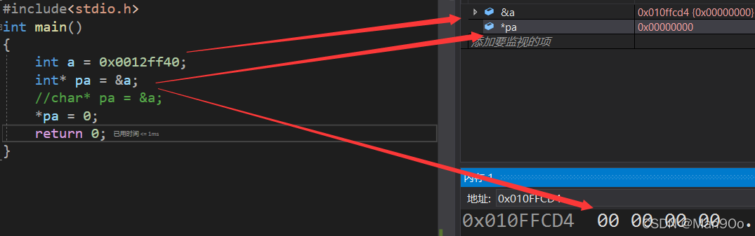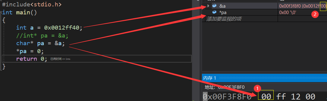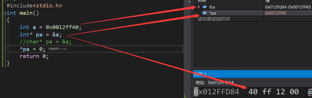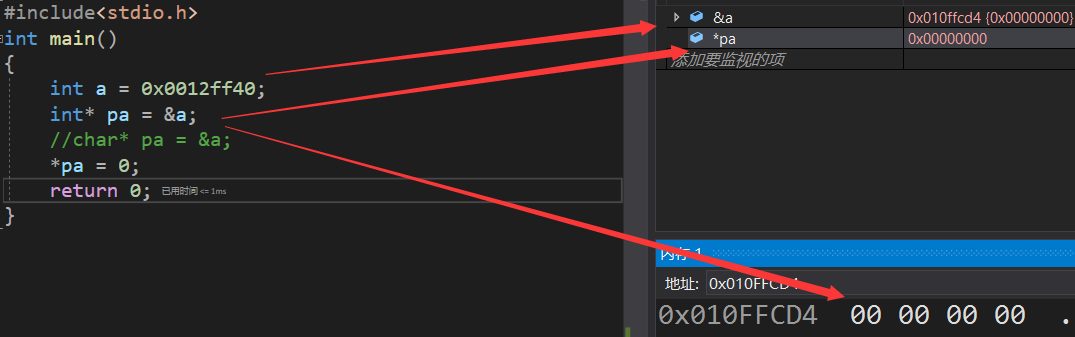 #include<stdio.h> int main() { int a = 0x0012ff40; int* pa = &a; //char* pa = &a; *pa = 0; return 0; }