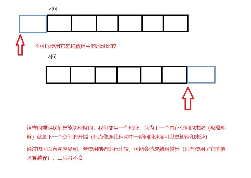 标准规定:允许指向数组元素的指针与指向数组最后一个元素后面的那个内存位置的指针比较,但是不允许与指向第一个元素之前的那个内存位置的指针进行比较。