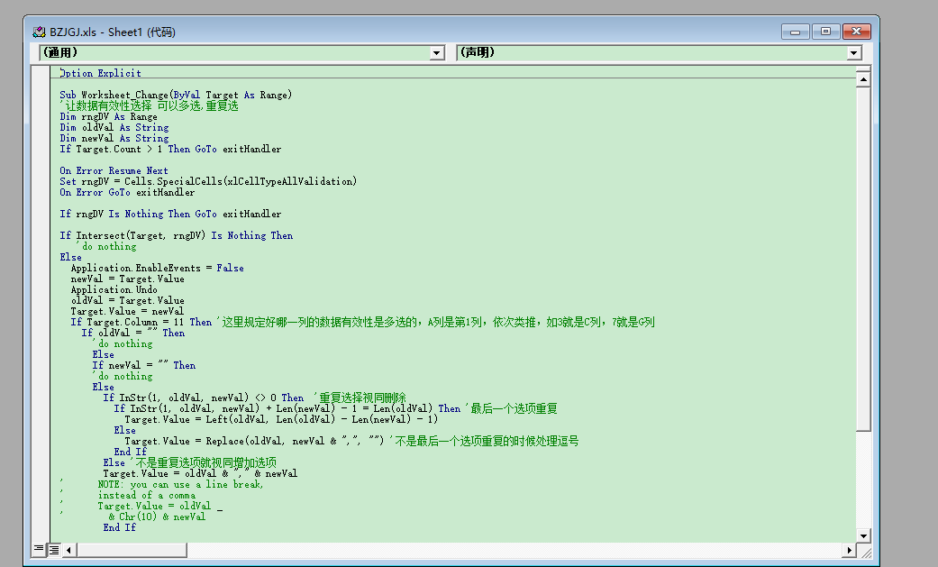 Option Explicit Sub Worksheet_Change(ByVal Target As Range) '让数据有效性选择 可以多选,重复选 Dim rngDV As Range Dim oldVal As String Dim newVal As String If Target.Count > 1 Then GoTo exitHandler On Error Resume Next Set rngDV = Cells.SpecialCells(xlCellTypeAllValidation) On Error GoTo exitHandler If rngDV Is Nothing Then GoTo exitHandler If Intersect(Target, rngDV) Is Nothing Then 'do nothing Else Application.EnableEvents = False newVal = Target.Value Application.Undo oldVal = Target.Value Target.Value = newVal If Target.Column = 11 Then '这里规定好哪一列的数据有效性是多选的,A列是第1列,依次类推,如3就是C列,7就是G列 If oldVal = "" Then 'do nothing Else If newVal = "" Then 'do nothing Else If InStr(1, oldVal, newVal) <> 0 Then '重复选择视同删除 If InStr(1, oldVal, newVal) + Len(newVal) - 1 = Len(oldVal) Then '最后一个选项重复 Target.Value = Left(oldVal, Len(oldVal) - Len(newVal) - 1) Else Target.Value = Replace(oldVal, newVal & ",", "") '不是最后一个选项重复的时候处理逗号 End If Else '不是重复选项就视同增加选项 Target.Value = oldVal & "," & newVal ' NOTE: you can use a line break, ' instead of a comma ' Target.Value = oldVal _ ' & Chr(10) & newVal End If End If End If End If End If exitHandler: Application.EnableEvents = True End Sub