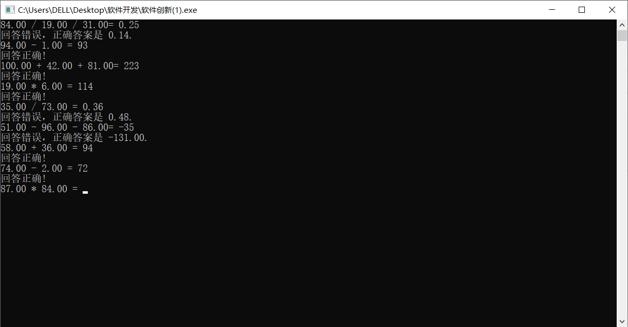 #include <stdio.h> #include <stdio.h> #include <stdlib.h> #include <time.h> void twojia() { srand(time(NULL)); float num1 = rand() % 101; float num2 = rand() % 101; char op; switch (rand() % 4) { case 0: op = '+'; break; case 1: op = '-'; break; case 2: op = '*'; break; case 3: op = '/'; break; } printf("%.2f %c %.2f = ", num1, op, num2); float answer; scanf("%f", &answer); float correct_answer; switch (op) { case '+': correct_answer = num1 + num2; break; case '-': correct_answer = num1 - num2; break; case '*': correct_answer = num1 * num2; break; case '/': correct_answer = num1 / num2; break; } if (answer == correct_answer) { printf("回答正确!\n"); } else { printf("回答错误,正确答案是 %.2f.\n", correct_answer); } } void threejia() { srand(time(NULL)); float num1 = rand() % 101; float num2 = rand() % 101; float num3 = rand() % 101; char op; switch (rand() % 4) { case 0: op = '+'; break; case 1: op = '-'; break; case 2: op = '*'; break; case 3: op = '/'; break; } printf("%.2f %c %.2f %c %.2f= ", num1, op, num2, op, num3); float answer; scanf("%f", &answer); float correct_answer; switch (op) { case '+': correct_answer = num1 + num2 + num3; break; case '-': correct_answer = num1 - num2 - num3; break; case '*': correct_answer = num1 * num2 * num3; break; case '/': correct_answer = num1 / num2 / num3; break; } if (answer == correct_answer) { printf("回答正确!\n"); } else { printf("回答错误,正确答案是 %.2f.\n", correct_answer); } } int main() { srand(time(NULL)); int i=0; while(i<300){ int a=rand()%2; switch(a){ case 0:twojia(); break; case 1:threejia(); break; default:break; } i++; } return 0; }