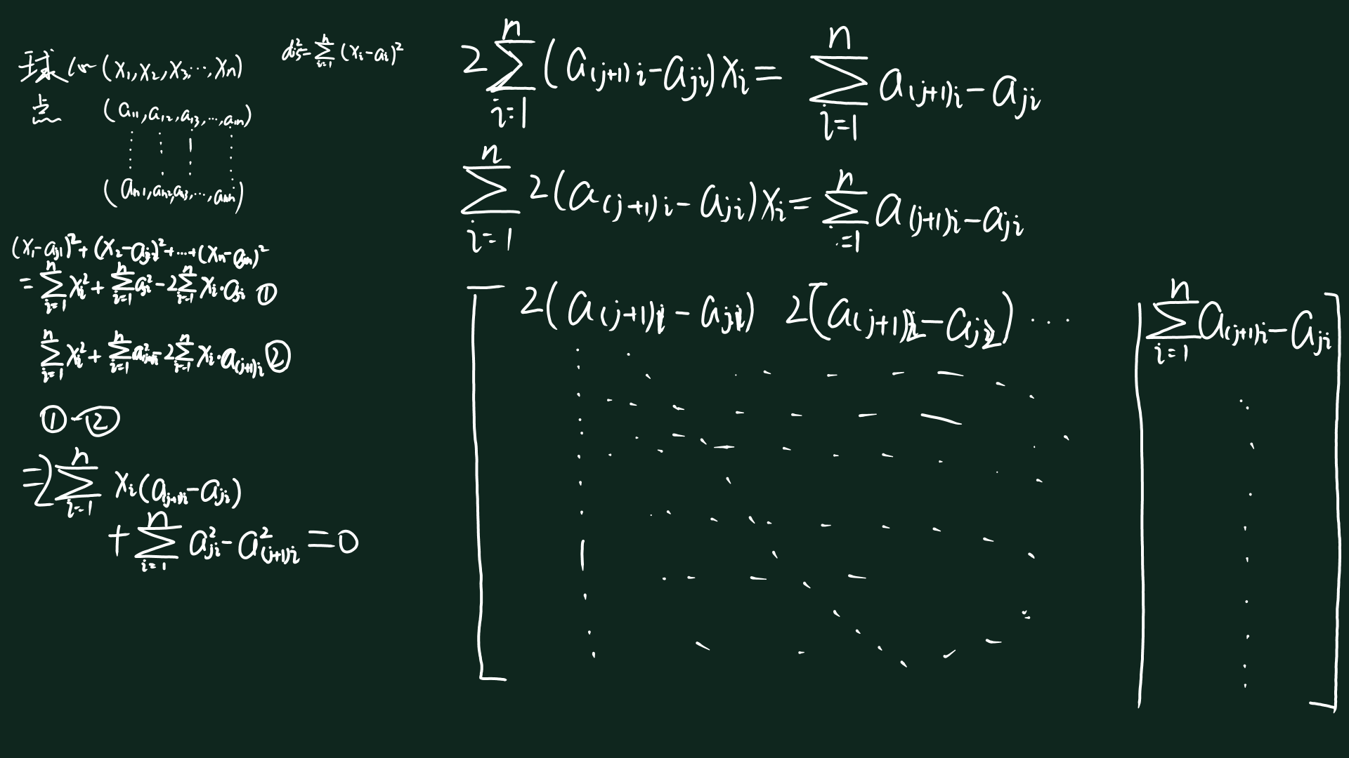 设球心为\(x(x_1,x_2,x_3,...,x_n)\),抓住球心到球上所有点的距离相等,我们可以列出若干个二次方程,然后再简单的消元得到了\(n\)个一次方程,这时候我们就可用高斯消元解决这个问题了