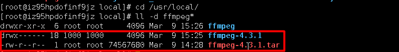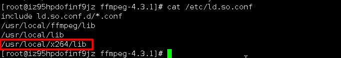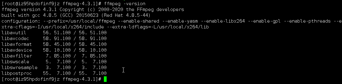 #进入解压后的目录 # cd /usr/local/ffmpeg-4.3.1 #编译安装,也指定安装路径,方便后期管理 # mkdir /usr/local/ffmpeg # ./configure --prefix=/usr/local/ffmpeg --enable-shared --enable-yasm --enable-libx264 --enable-gpl --enable-pthreads --extra-cflags=-I/usr/local/x264/include --extra-ldflags=-L/usr/local/x264/lib # make -j4 # make install