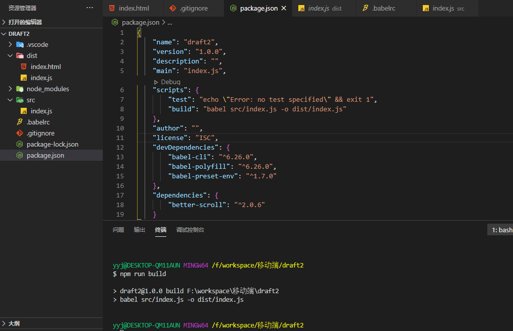 2、要使用babel命令,需要在package.json文件的scripts对象中配置:"build": "babel src/index.js -o dist/index.js"