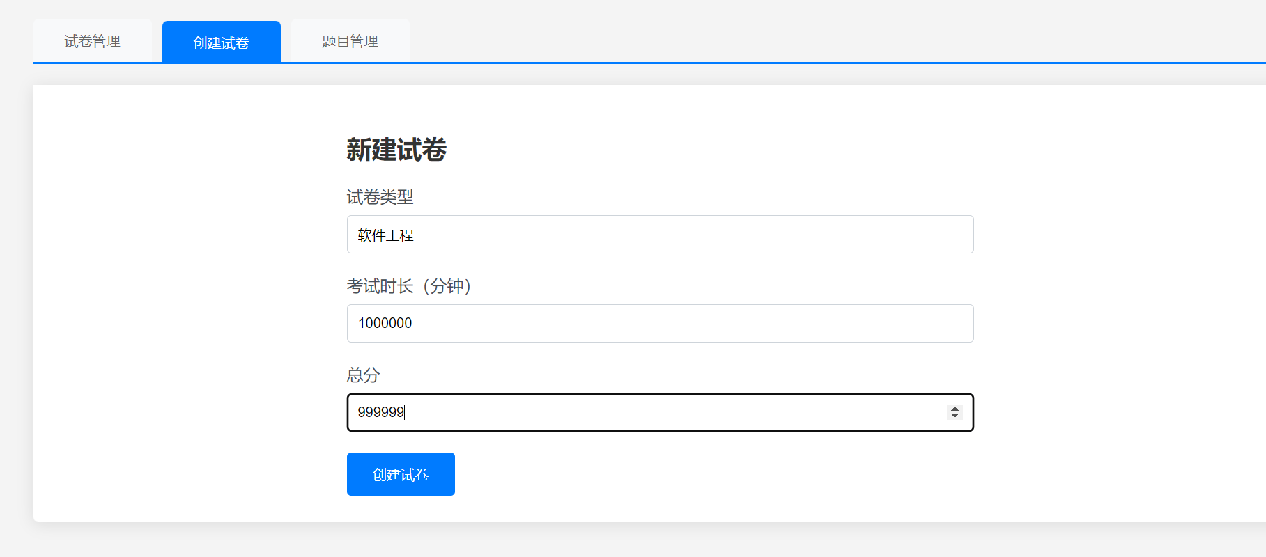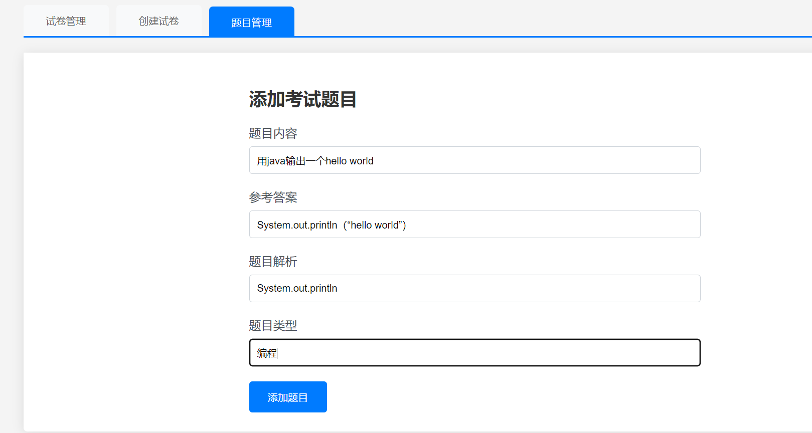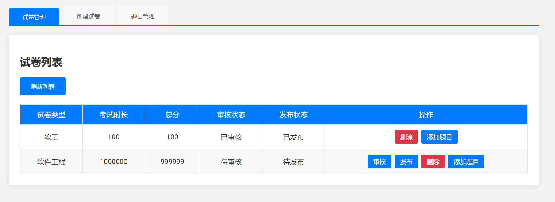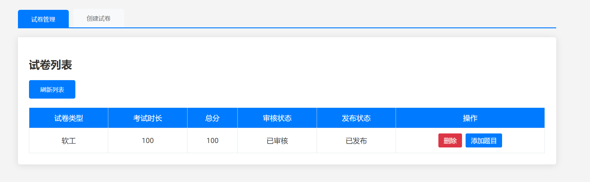 界面演示:首先在首页可以看到试卷的相关信息,相应的试卷可以添加对应的题目 这些题目可以进行增删改查并且设置标准答案