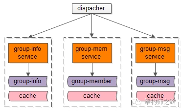如果所有的信息存储都在一个service里,那么一个地方出bug,就将影响整个业务,所以更合理的做法是在服务层进行细分,架构如何细分?垂直拆分是个好的方案,将子业务一个个拆出来,那么微信的服务化架构或许会变成这个样子: