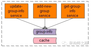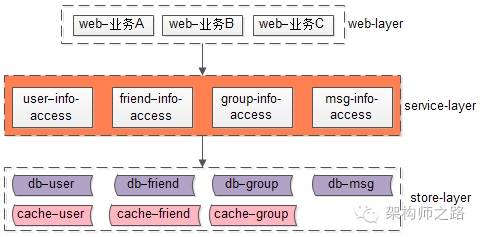 最粗犷的玩法,所有基础数据的访问,都通过一个service访问,在业务不是特别复杂的时候还好,一旦业务变复杂了,这个service层会变得非常重,成为耦合点之一,以微信场景为例,假设有一个通用的服务层来访问基础数据,这个服务层可能是这样的:
