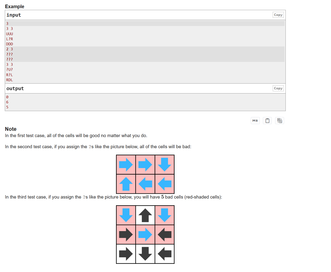 For each test case, print a single integer, the maximum number of starting cells from which Rostam will be trapped forever after assigning directions to the unspecified cells optimally.