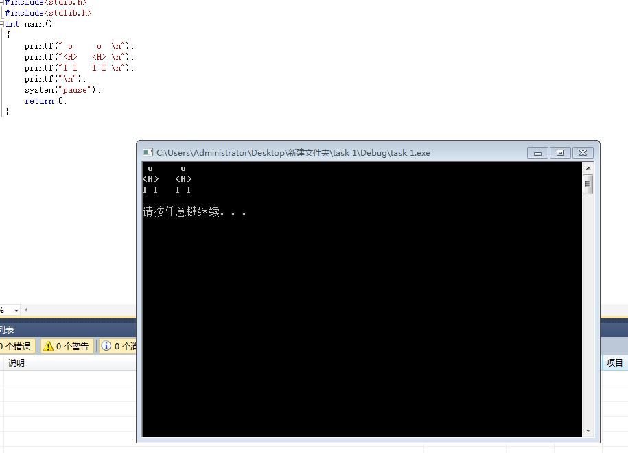 #include<stdio.h> #include<stdlib.h> int main() { printf(" o o \n"); printf("<H> <H> \n"); printf("I I I I \n"); printf("\n"); system("pause"); return 0; }