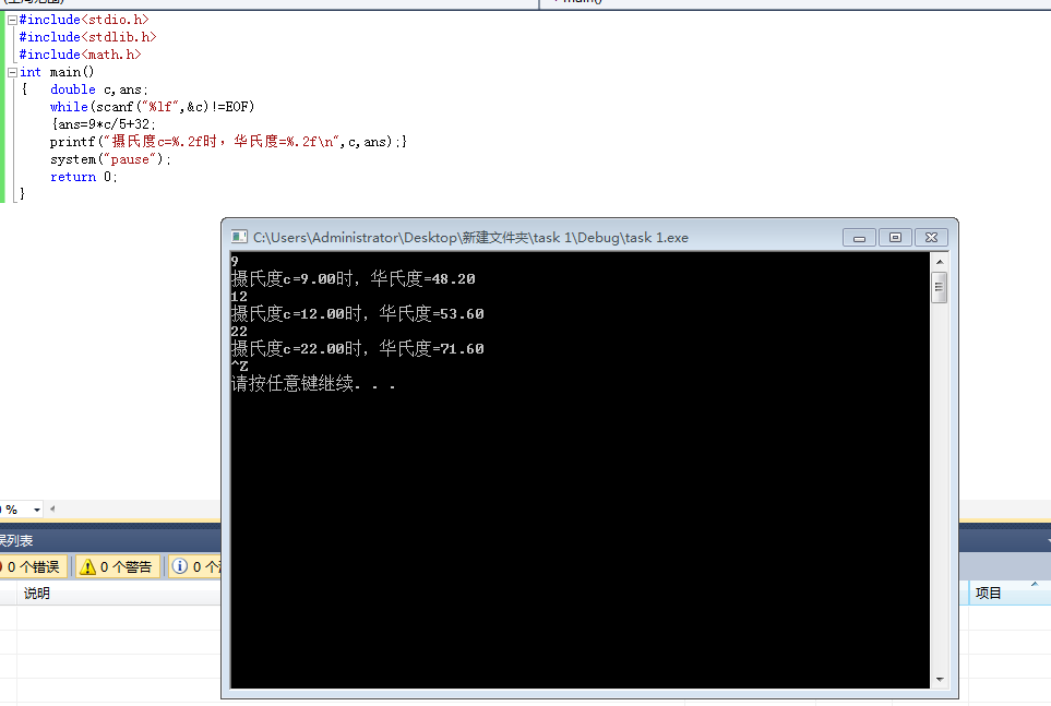 #include<stdio.h> #include<stdlib.h> #include<math.h> int main() { double c,ans; while(scanf("%lf",&c)!=EOF) {ans=9*c/5+32; printf("摄氏度c=%.2f时,华氏度=%.2f\n",c,ans);} system("pause"); return 0; }