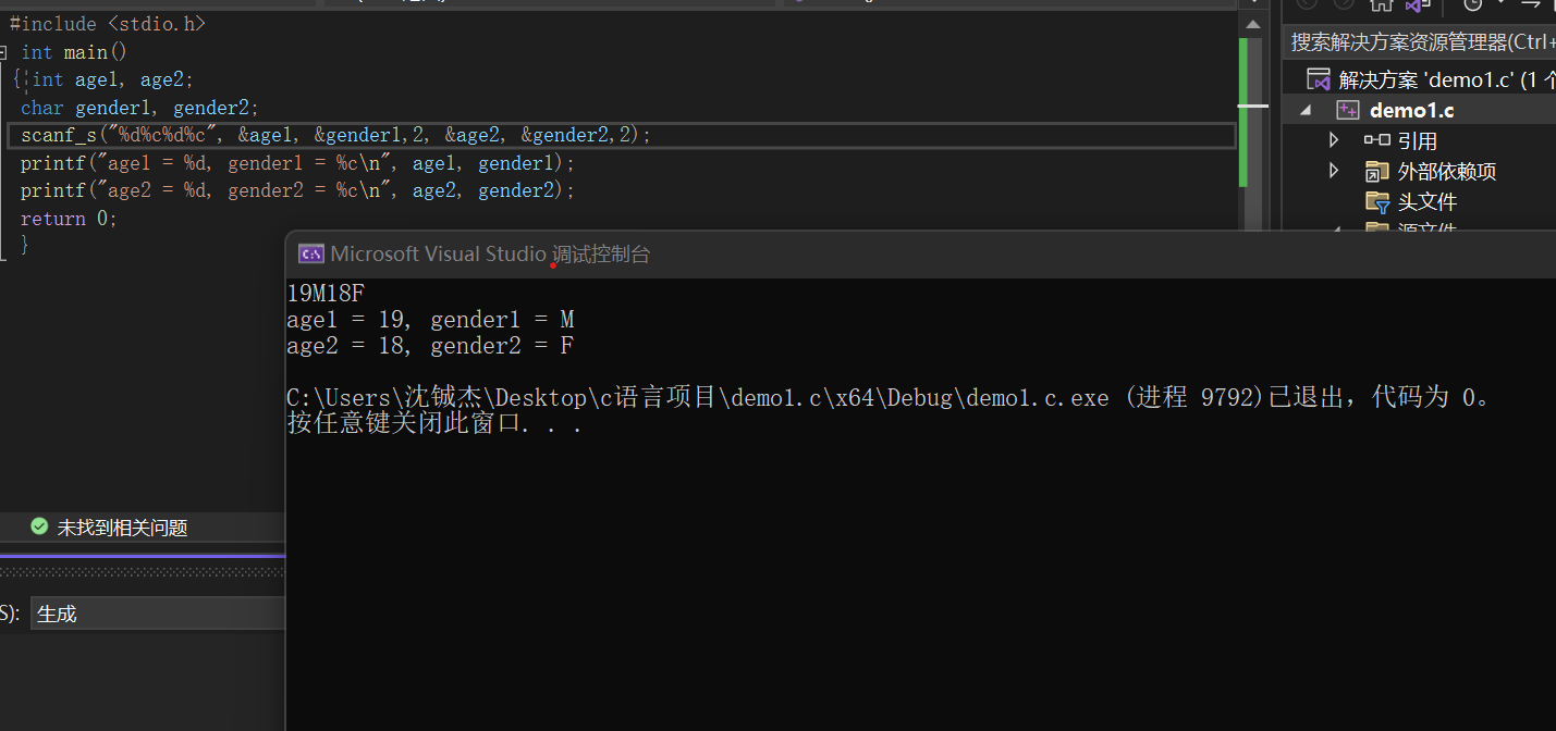 #include <stdio.h> int main() { int age1, age2; char gender1, gender2; scanf_s("%d%c%d%c", &age1, &gender1,2, &age2, &gender2,2); printf("age1 = %d, gender1 = %c\n", age1, gender1); printf("age2 = %d, gender2 = %c\n", age2, gender2); return 0; }